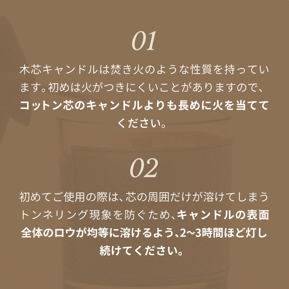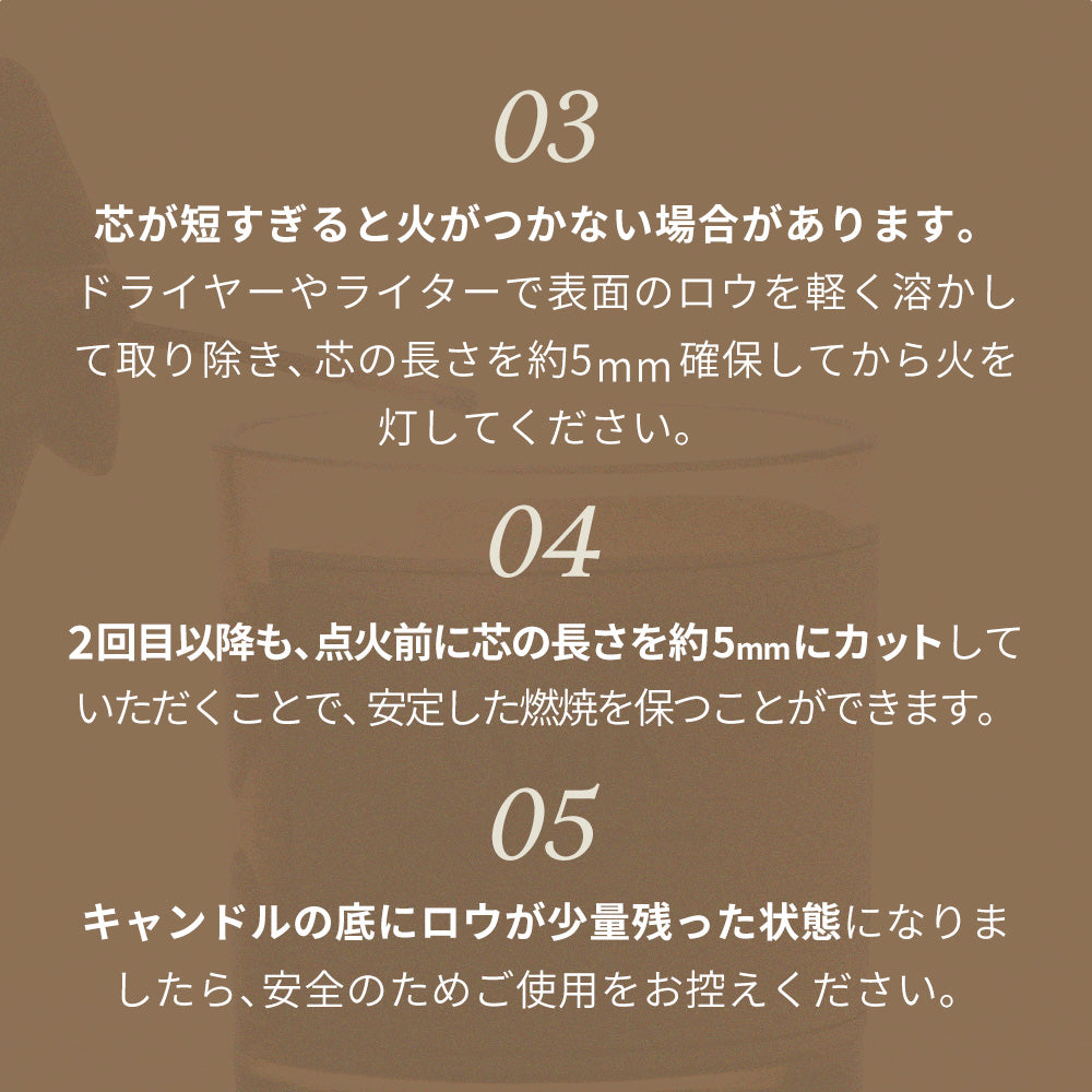 | 使用上の注意 | 【使用上の注意】燃えやすい物の近くや風の当たる場所では使用しないでください。燃焼中はその場を離れないでください。芯が長すぎると炎が大きくなり、ススが出やすくなりますので、芯の長さは約5mmに整えてからご使用ください。燃焼中及び消火直後は、器やロウが熱くなっておりますので、火傷にご注意ください。使用中、異常を感じた場合はすぐに使用を中止してください。平らで安定した場所で使用してください。キャンドルを移動する際は、火を消してロウが冷めたのを確認してからにしてください。火を灯したままで放置しないでください。就寝時には必ず火を消してください。乳幼児やペットの手の届かない場所で使用・保管してください。火の取扱いには十分ご注意ください。本品は食べ物・飲み物ではありません。口に入れないでください。高温多湿・直射日光を避けて保管してください。 |